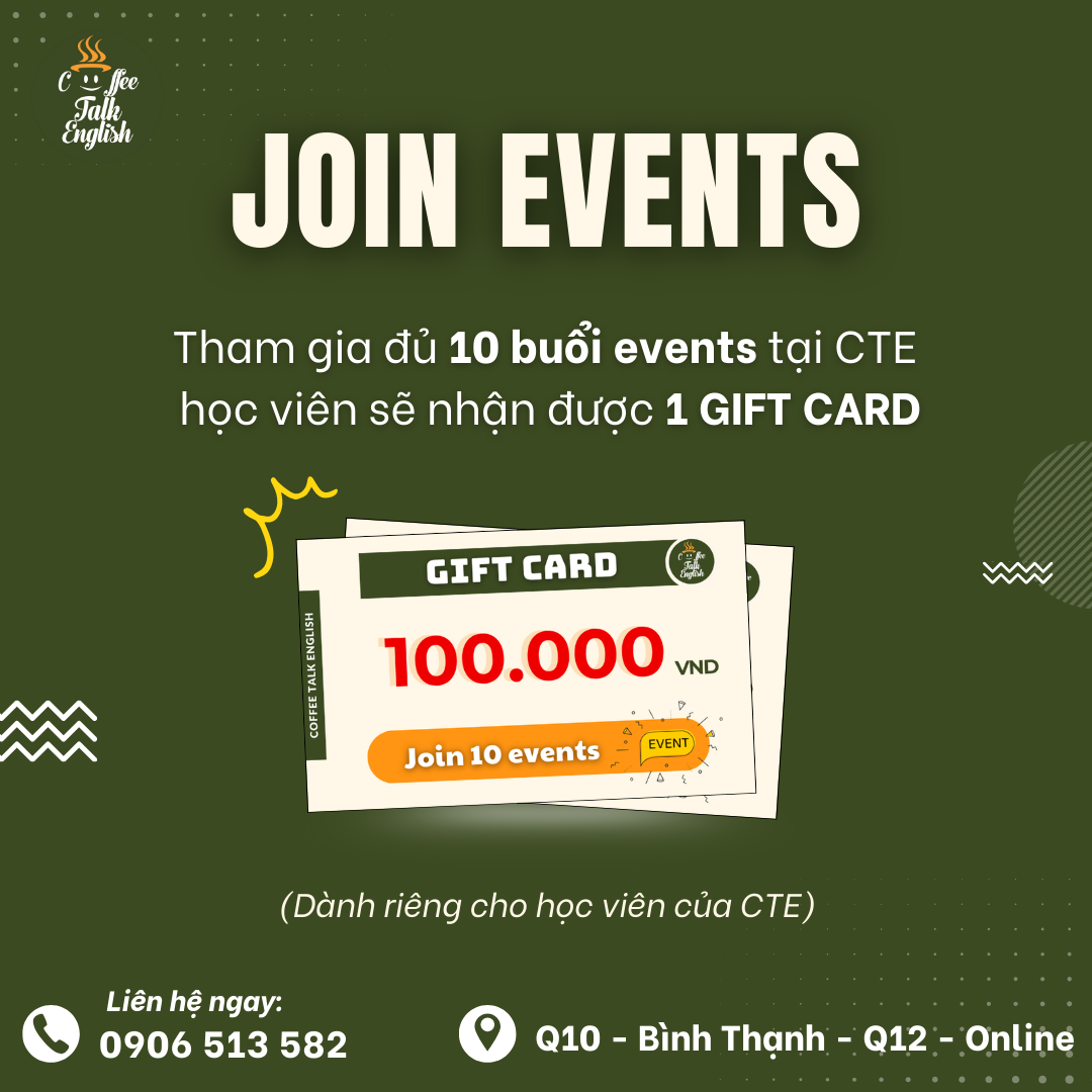 Các sự kiện luyện giao tiếp tiếng Anh được tổ chức tại cả 3 chi nhánh của CTE: Quận 10, Bình Thạnh, và Quận 12, bao gồm: